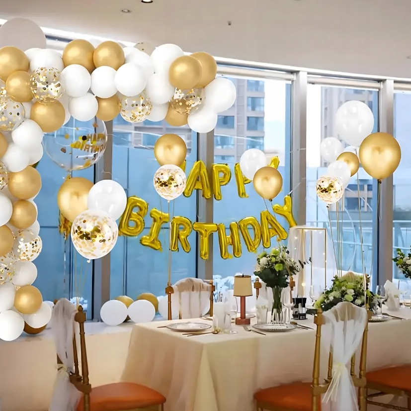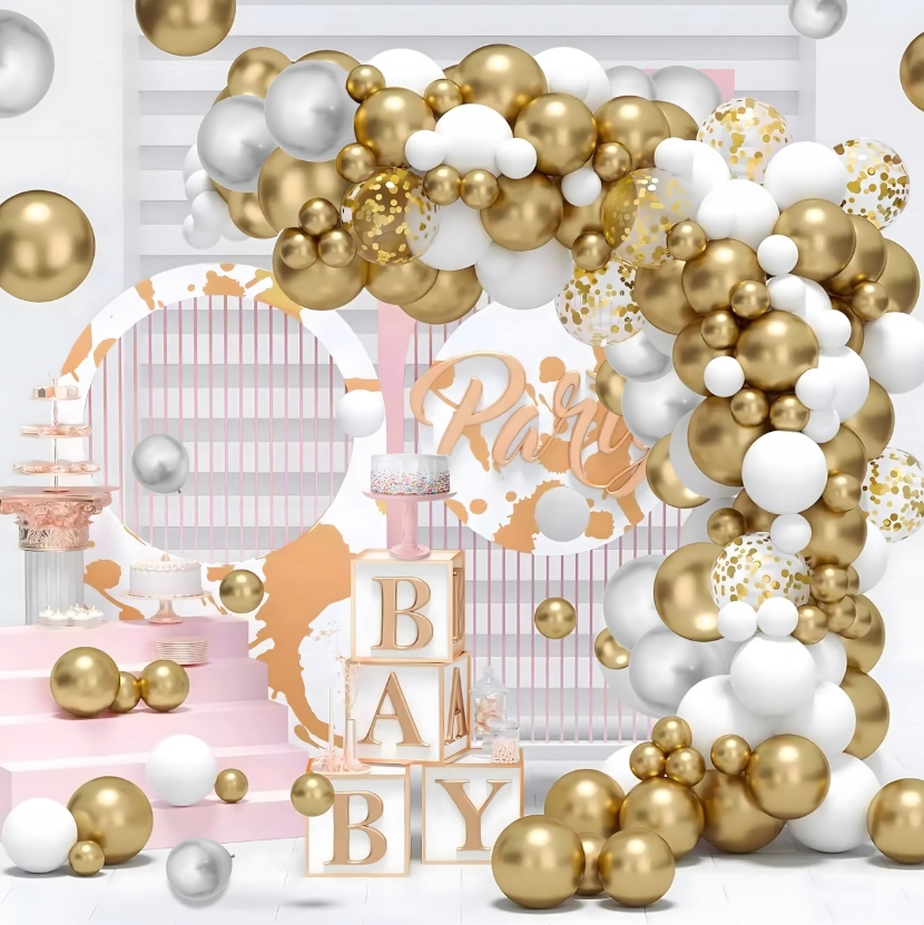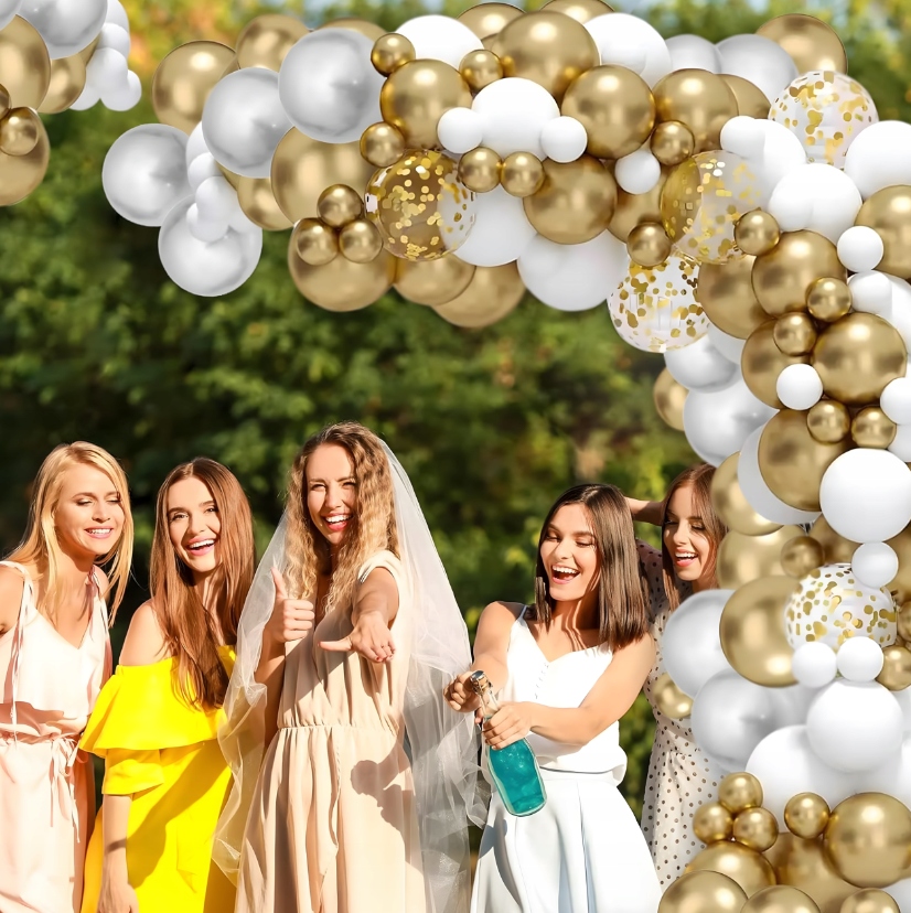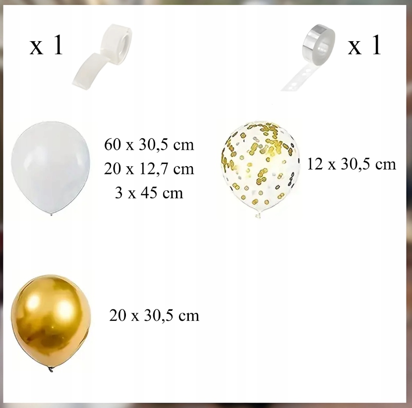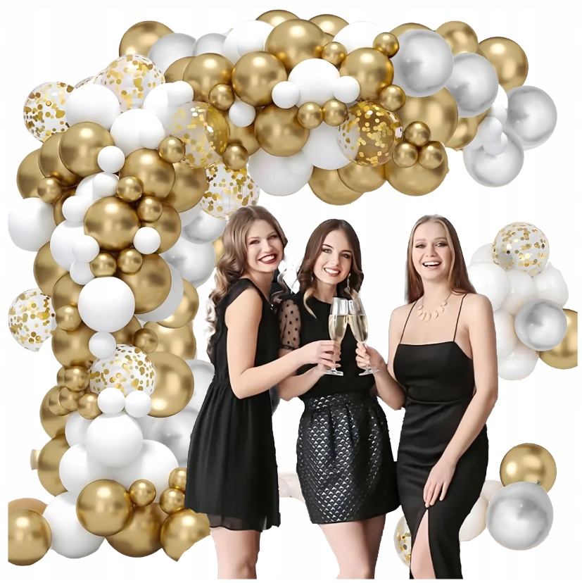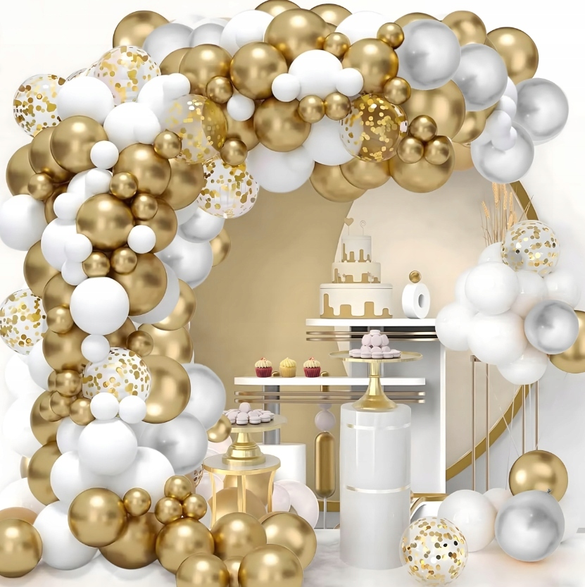 Kompletny zestaw eleganckich balonów w białej, złotej i transparentnej kolorystyce, idealny do stworzenia dekoracyjnej girlandy lub łuku. Doskonały wybór na uroczystości wymagające stylowej oprawy – od urodzin, przez wesela, po eventy firmowe.