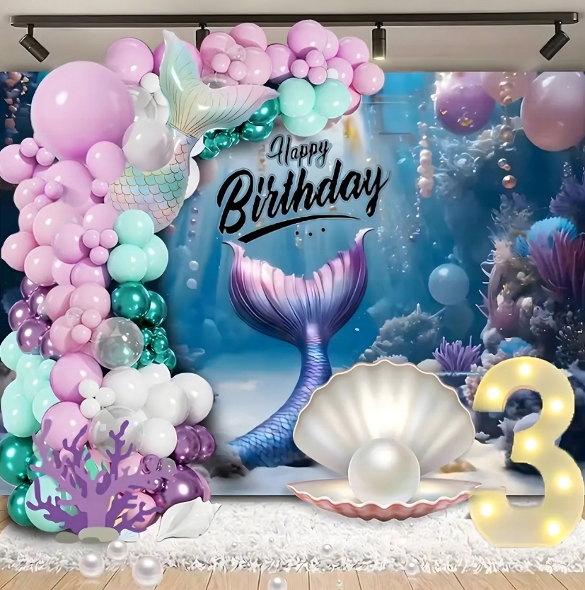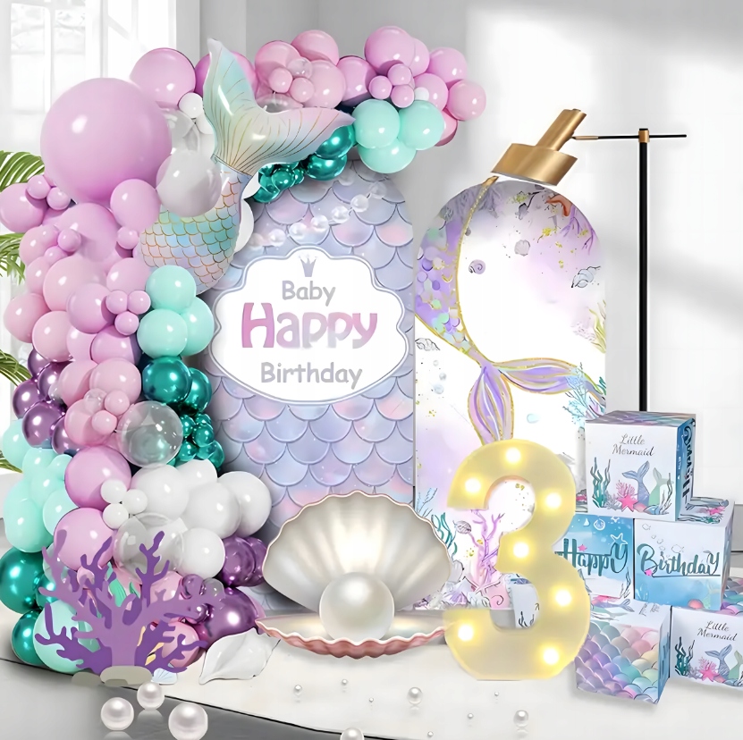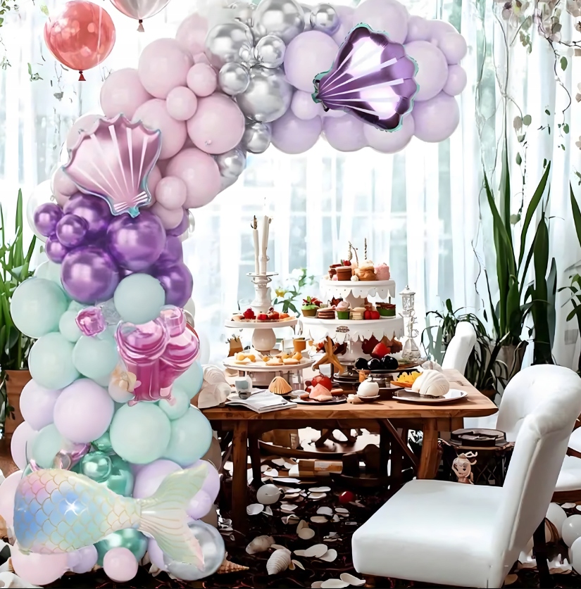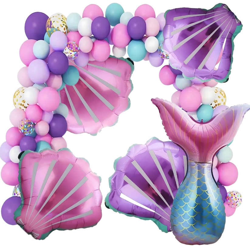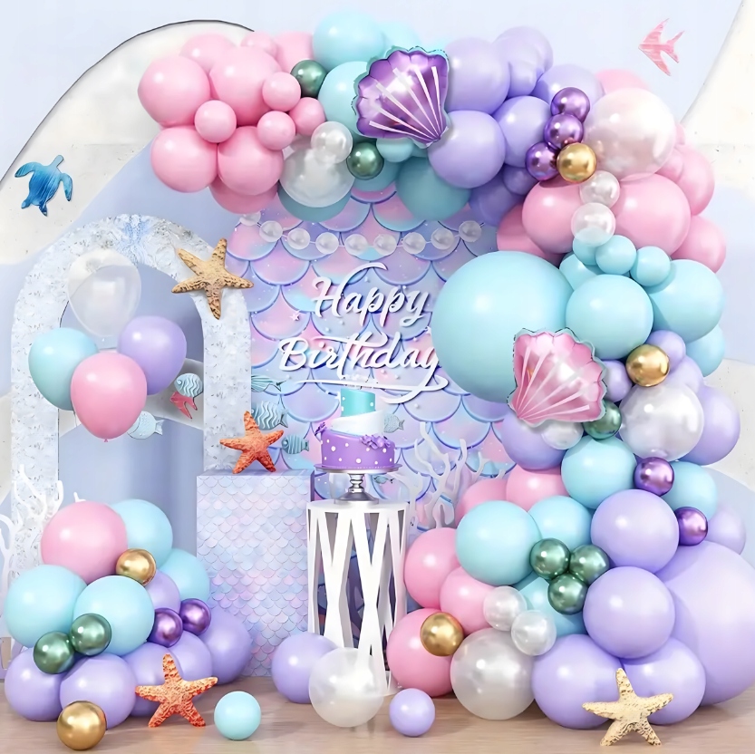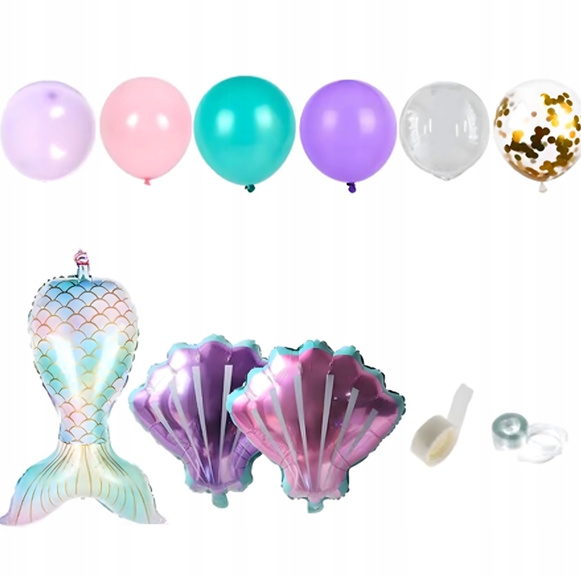 Kompletny zestaw dekoracyjny w pastelowej kolorystyce z balonami foliowymi w kształcie ogona syreny i muszli. Doskonały na przyjęcia w stylu bajkowym, urodziny, baby shower czy inne uroczystości. Różnorodność kolorów i rozmiarów balonów pozwala stworzyć efektowny łuk lub girlandę, która będzie przyciągać wzrok gości i stanowić idealne tło do zdjęć.