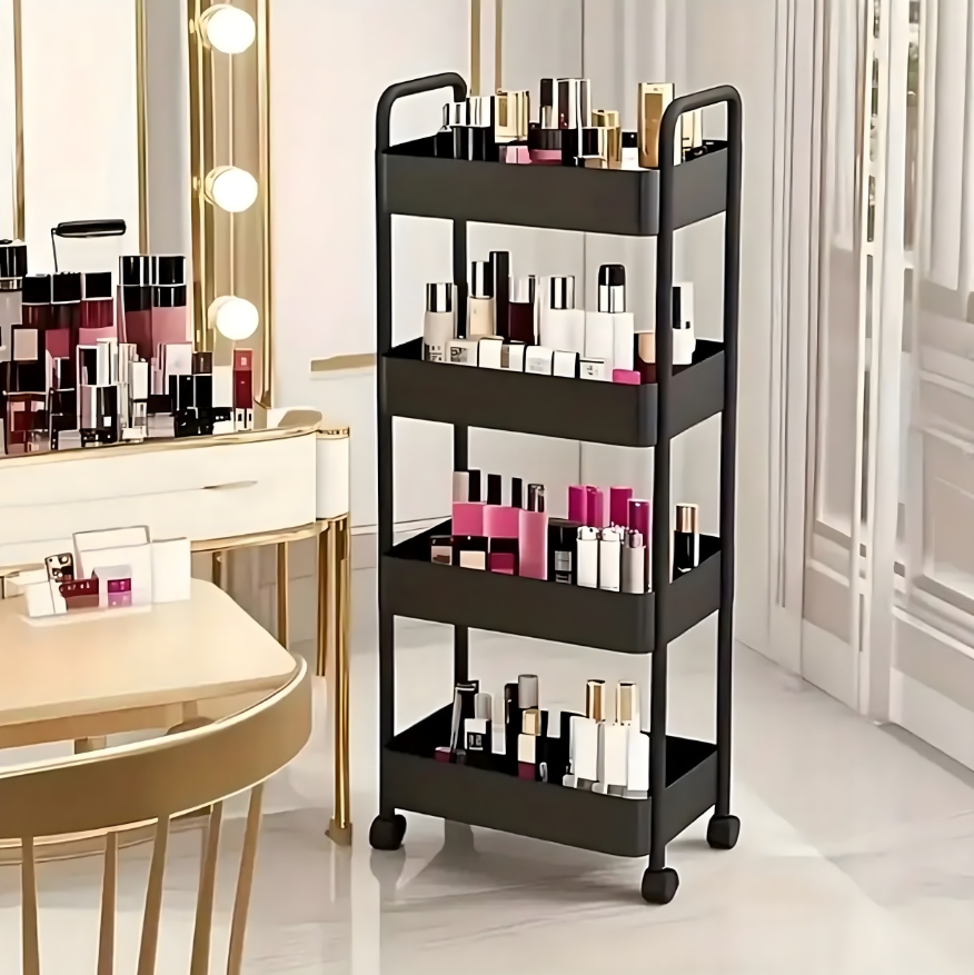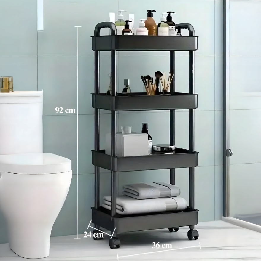 Idealne rozwiązanie do uporządkowania łazienki, kuchni lub dowolnej przestrzeni, która potrzebuje dodatkowego miejsca do przechowywania! Mobilny regał 4-poziomowy na kółkach łączy funkcjonalność z nowoczesnym designem, pasując do każdej aranżacji.