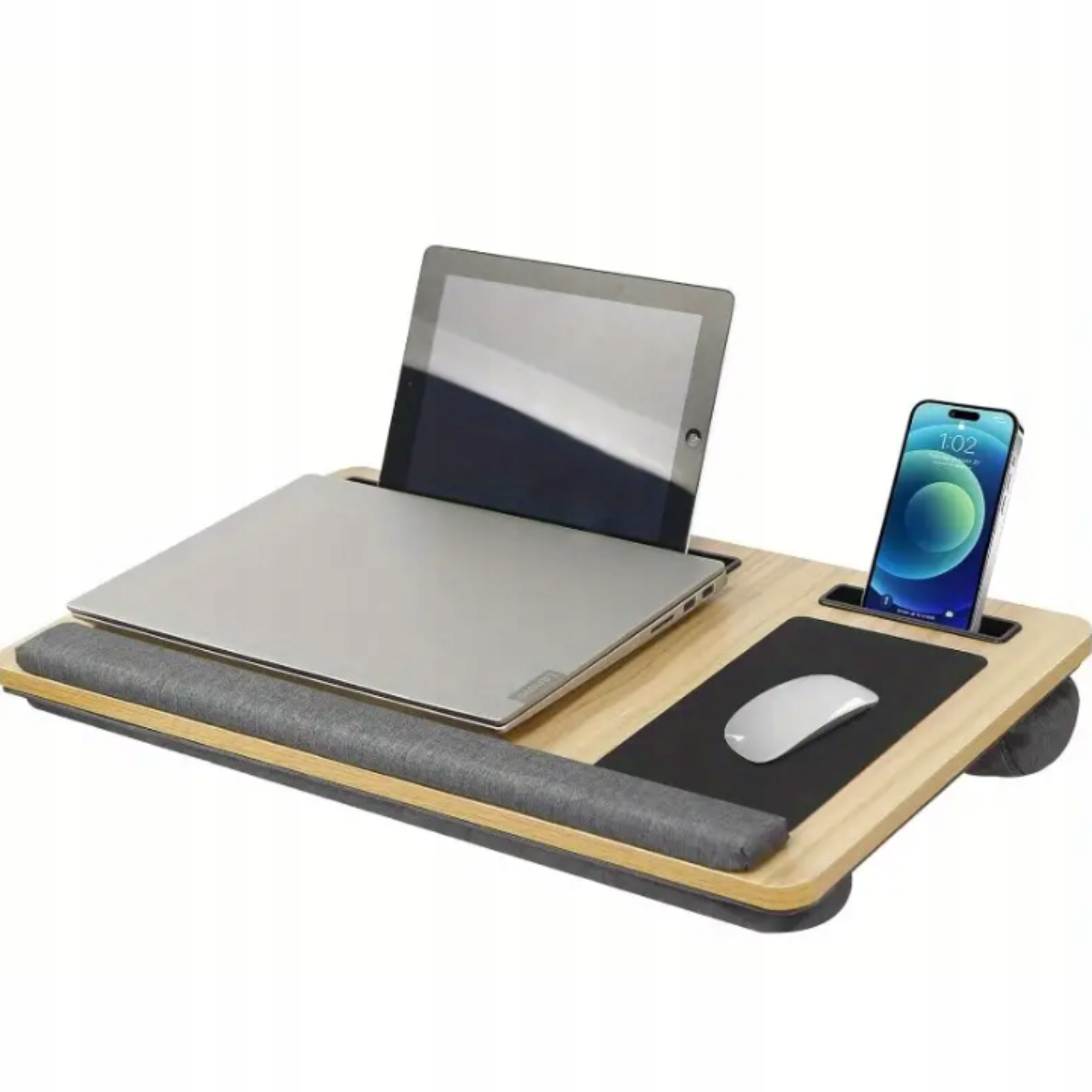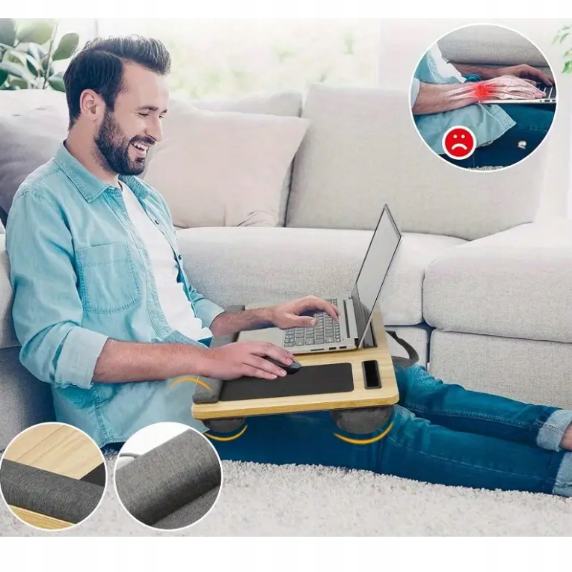 Dzięki miękkiej podstawie, biurko nie nagrzewa się i nie uciska nóg, co pozwala komfortowo korzystać z laptopa przez długie godziny — w łóżku, na kanapie czy w podróży.