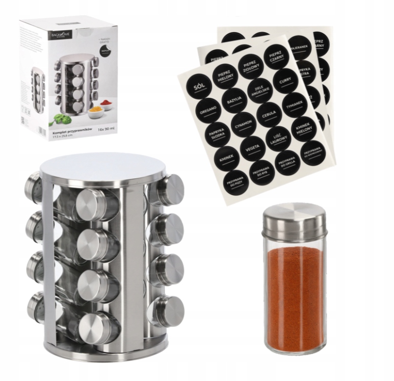 W komplecie znajduje się zestaw aż 38 samoprzylepnych etykiet z nazwami najpopularniejszych przypraw. Pozwalają one na stworzenie czytelnego i estetycznego systemu organizacji.