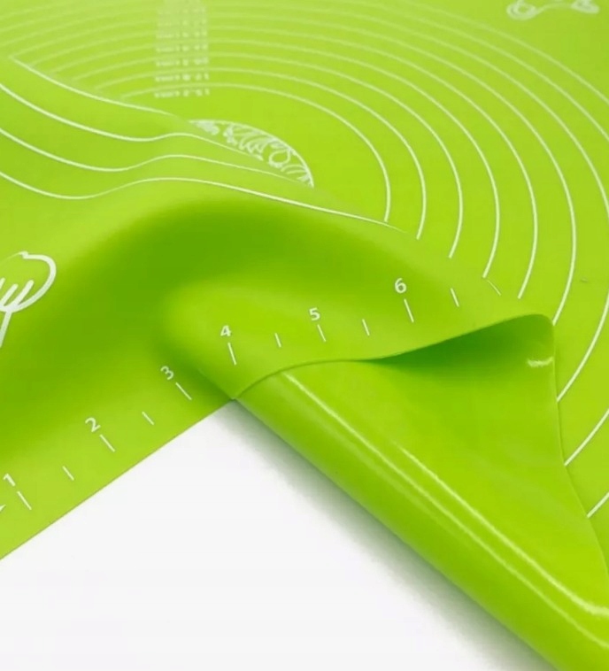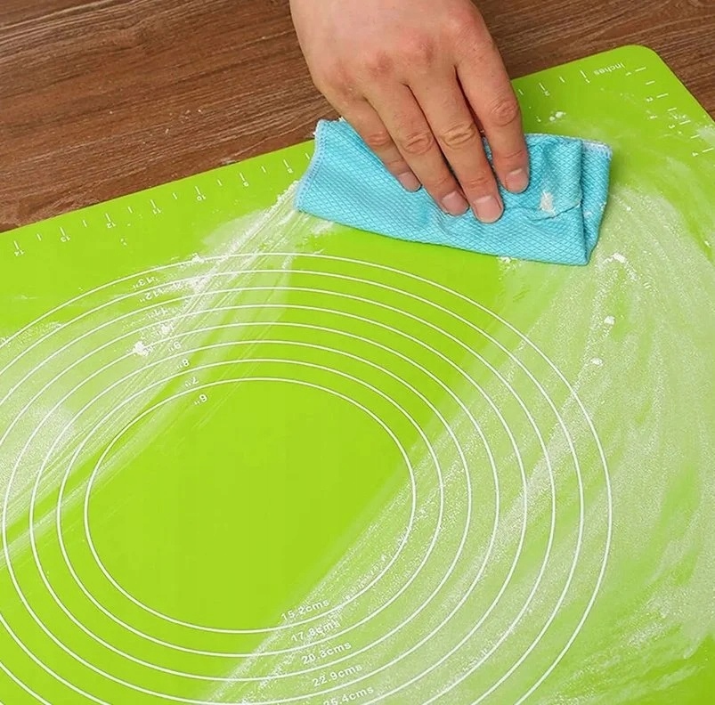Nowoczesna, zwijana mata silikonowa, z jednej strony mamy powłokę zapobiegającą przywieraniu, z drugiej strony świetnie trzyma się blatu zapobiegając przesuwaniu maty;