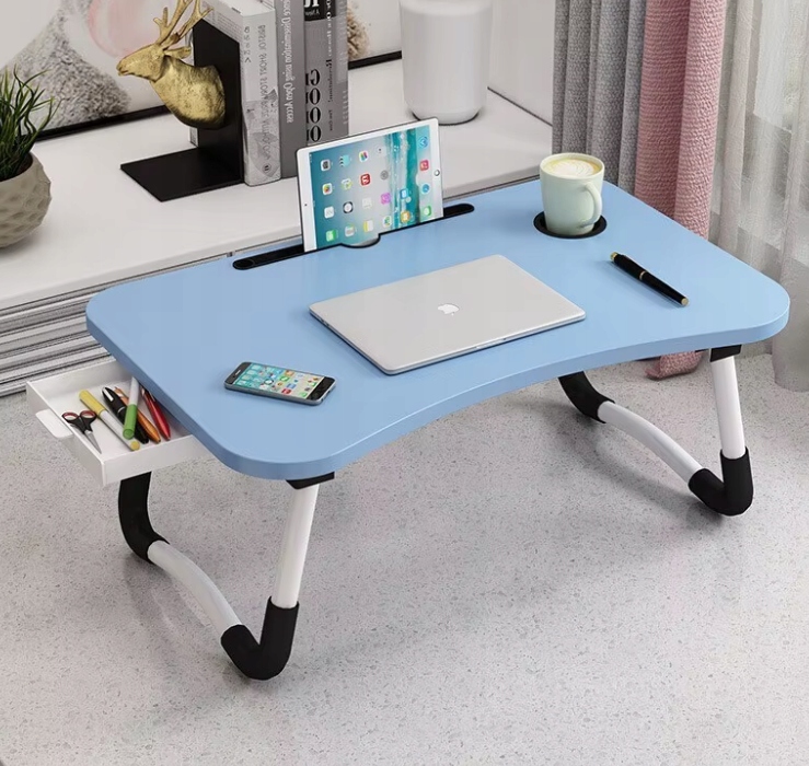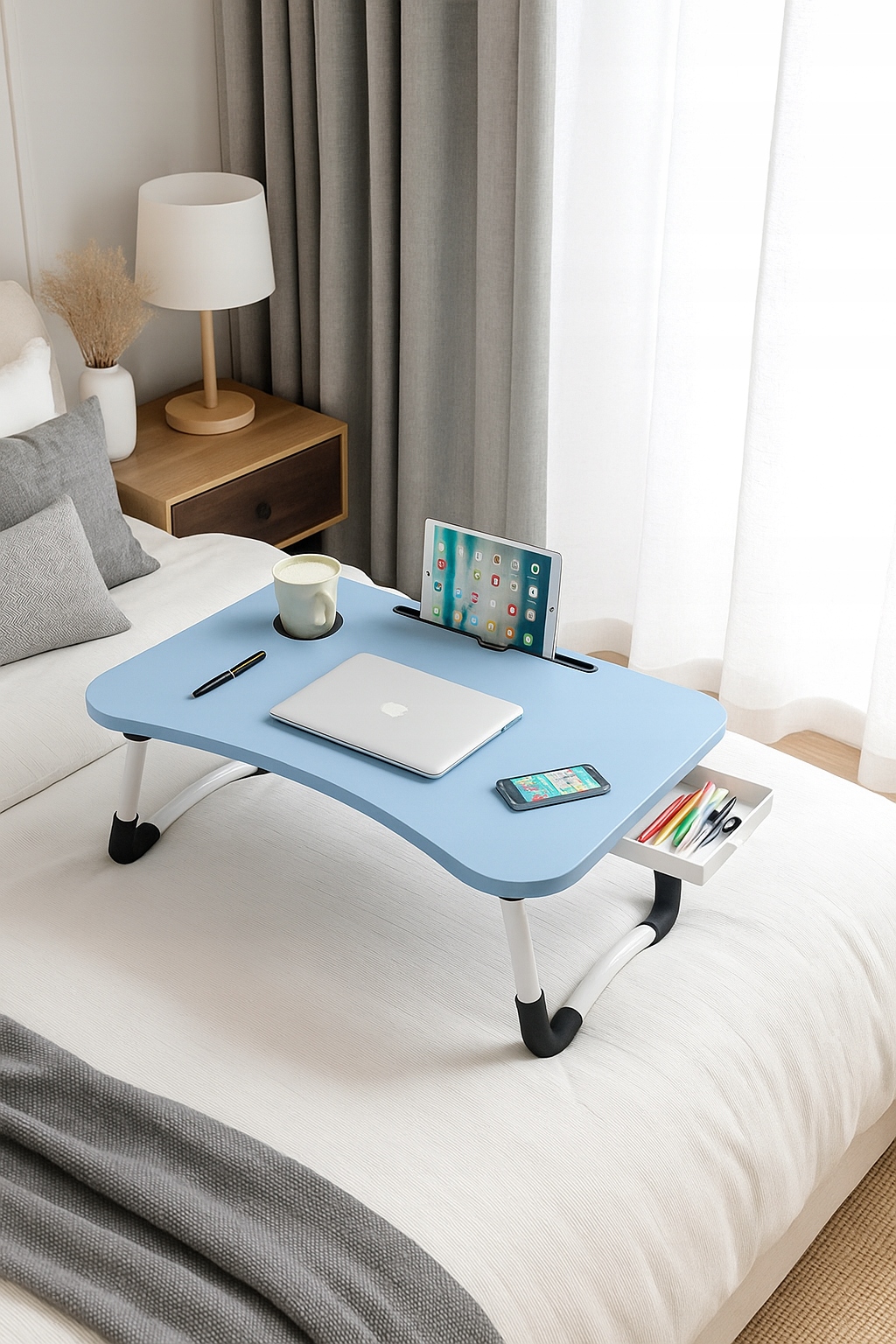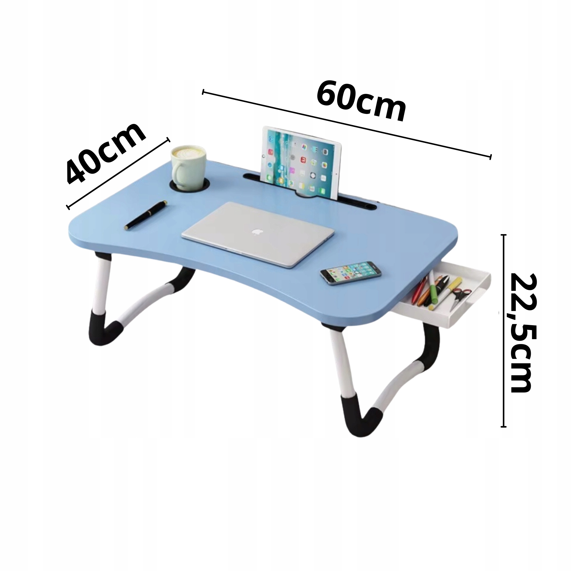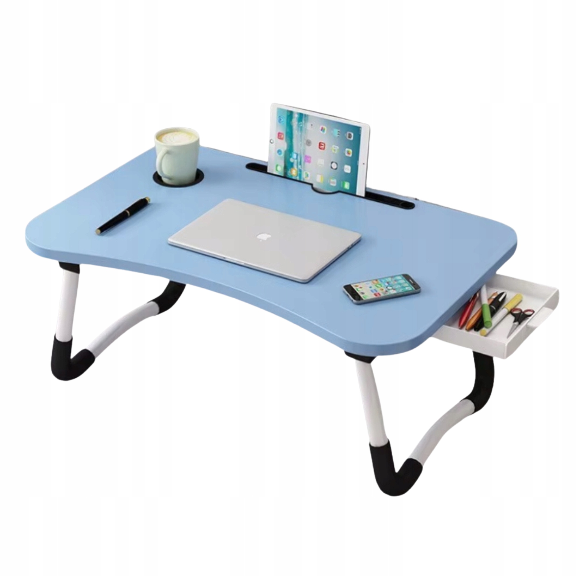 Składany stolik śniadaniowy / laptopowy z uchwytem na telefon, miejscem na kubek i wysuwaną szufladką