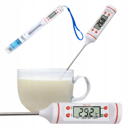 Długa, wytrzymała igła zakończona czujnikiem pozwala dokładnie mierzyć temperaturę cieczy, oleju oraz powietrza – zarówno w domu, jak i w pracy.