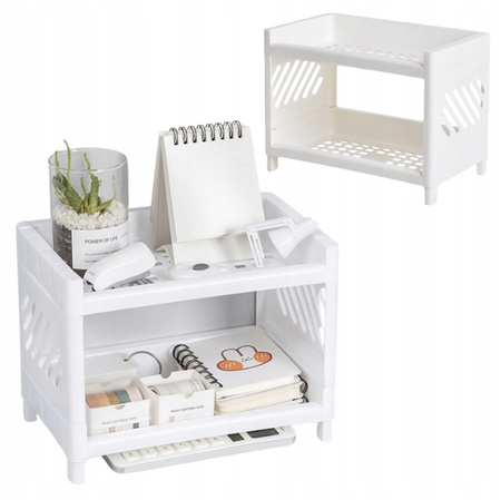 Dwupoziomowa konstrukcja pozwala na wygodne segregowanie akcesoriów, takich jak przybory biurowe, notesy, kosmetyki, butelki czy przyprawy. Ażurowe ścianki nadają mu lekkości, a jednocześnie ułatwiają utrzymanie czystości. Stabilna forma i kompaktowe wymiary sprawiają, że organizer nie zajmuje dużo miejsca, oferując jednocześnie sporą przestrzeń do przechowywania.
