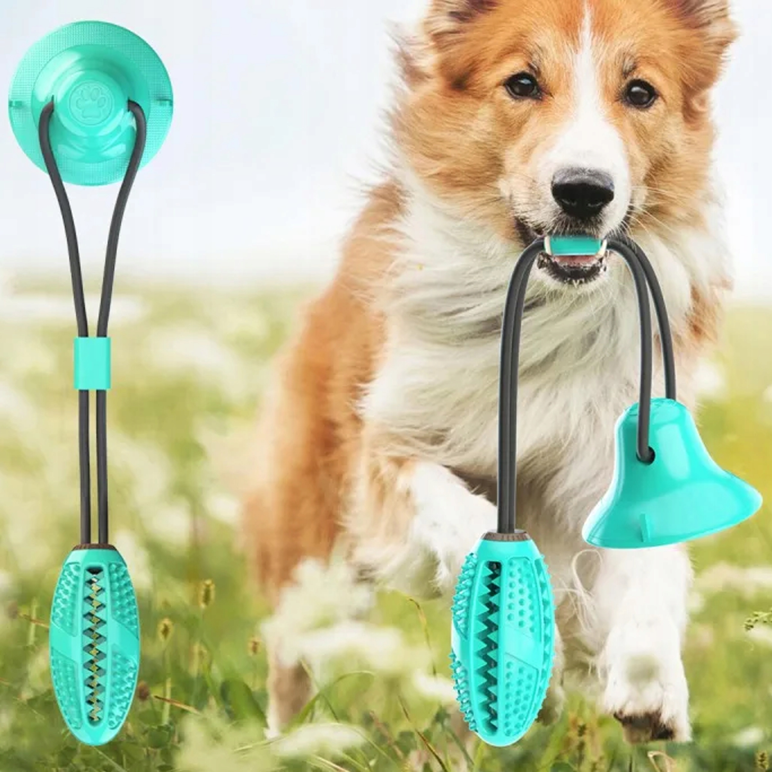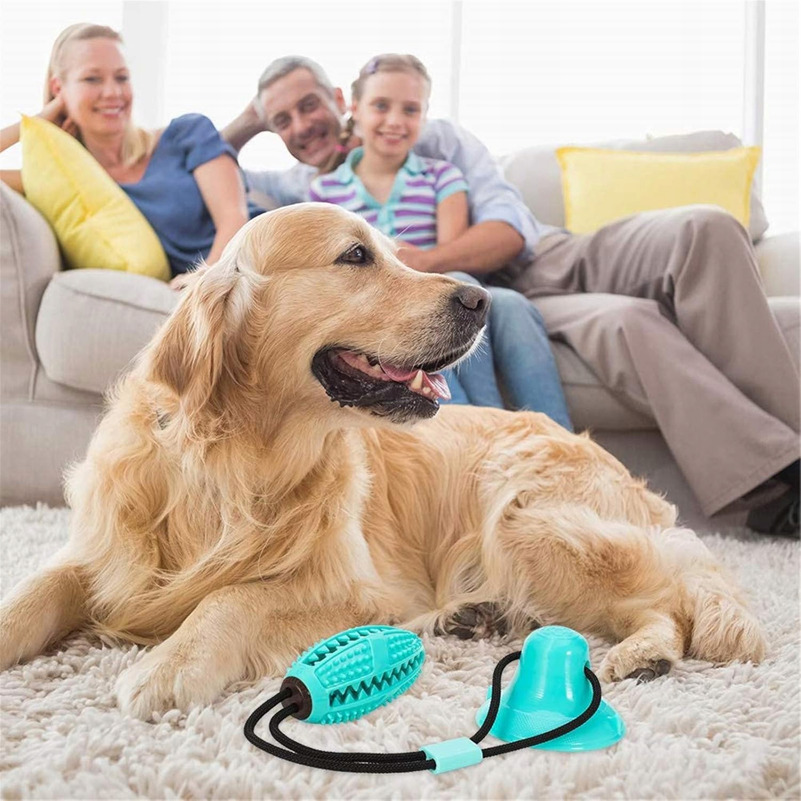 ➡️Całość zabawki skonstruowana została w taki sposób, aby po przyklejeniu przyssawki do podłogi lub innego miejsca pies mógł szarpać za znajdującą się na drugim końcu piłkę.