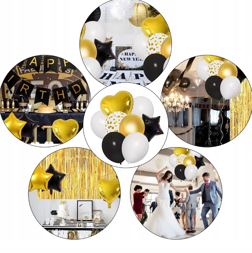 Stylowy zestaw dekoracyjny w eleganckich odcieniach czerni, złota i bieli z dodatkiem złotego konfetti to doskonały sposób na podkreślenie wyjątkowego jubileuszu. Komplet zawiera wszystkie elementy potrzebne do stworzenia imponującej aranżacji – od balonów w różnych rozmiarach po złotą kurtynę i baner „Happy Birthday”, które tworzą efektowne tło do zdjęć.
