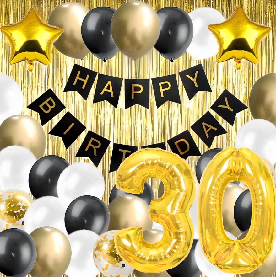 - Kompletny zestaw XXL – 54 balony w różnych kolorach i rozmiarach, cyfry „3” i „0”, złota kurtyna oraz baner.