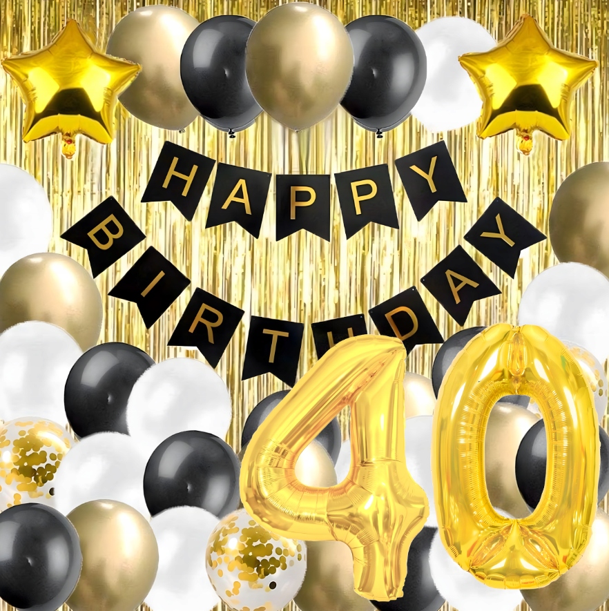 - Kompletny zestaw XXL – 54 balony w różnych kolorach i rozmiarach, cyfry „4” i „0”, złota kurtyna oraz baner.
