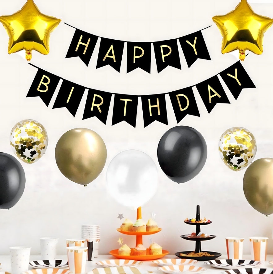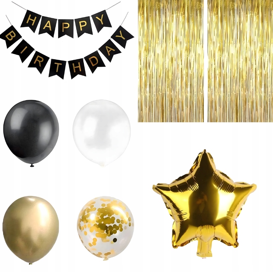 Elegancki zestaw dekoracyjny w odcieniach czerni, złota i bieli z dodatkiem złotego konfetti to efektowny sposób na podkreślenie wyjątkowego jubileuszu. Kompletny zestaw pozwala stworzyć imponującą aranżację wnętrza lub przestrzeni na świeżym powietrzu, a złota kurtyna i baner „Happy Birthday” tworzą idealne tło do pamiątkowych zdjęć.