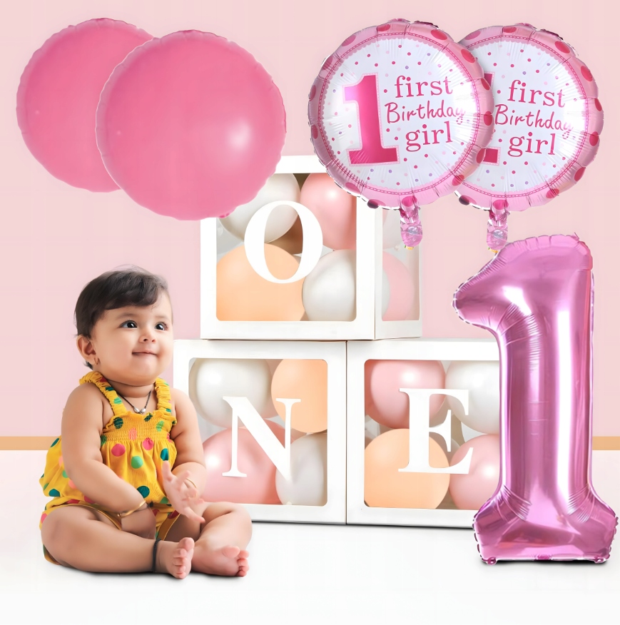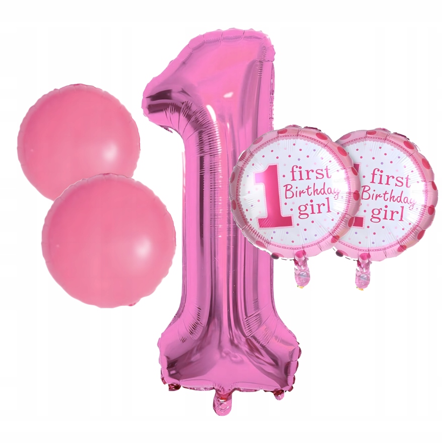 - Pełny zestaw 5 elementów – cyfra 1, 2 balony „First Birthday Girl” i 2 gwiazdki.