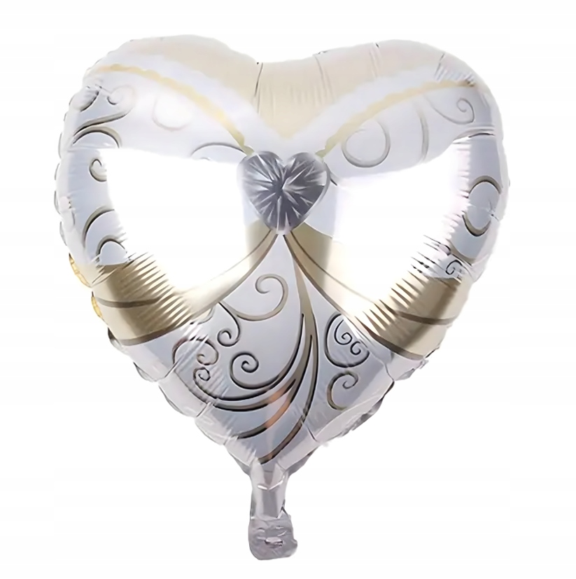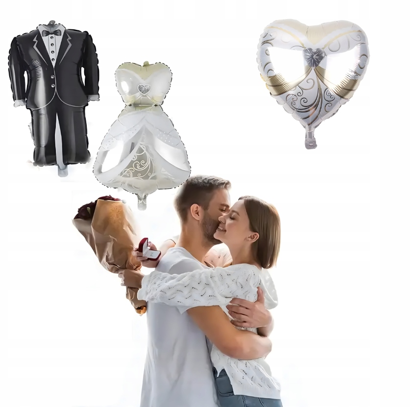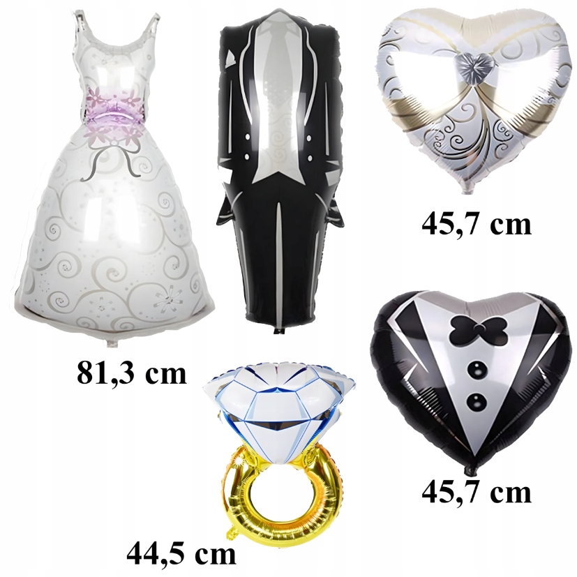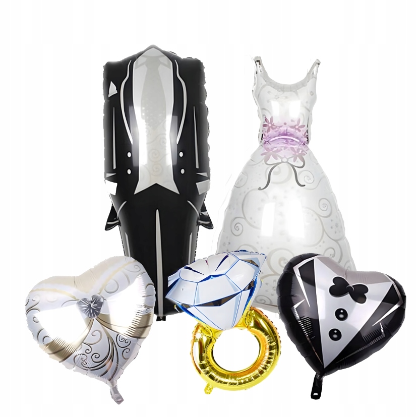 - Komplet 5 balonów: suknia, garnitur, dwa serca i pierścionek zaręczynowy.