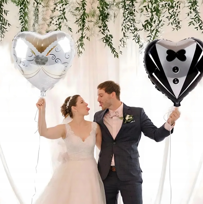 Stylowy komplet balonów foliowych w kształcie sukni ślubnej, garnituru, serc i pierścionka zaręczynowego. Idealnie nadają się jako dekoracja na ślub, wesele, wieczór panieński lub kawalerski, a także sesje zdjęciowe i uroczystości związane z zaręczynami.